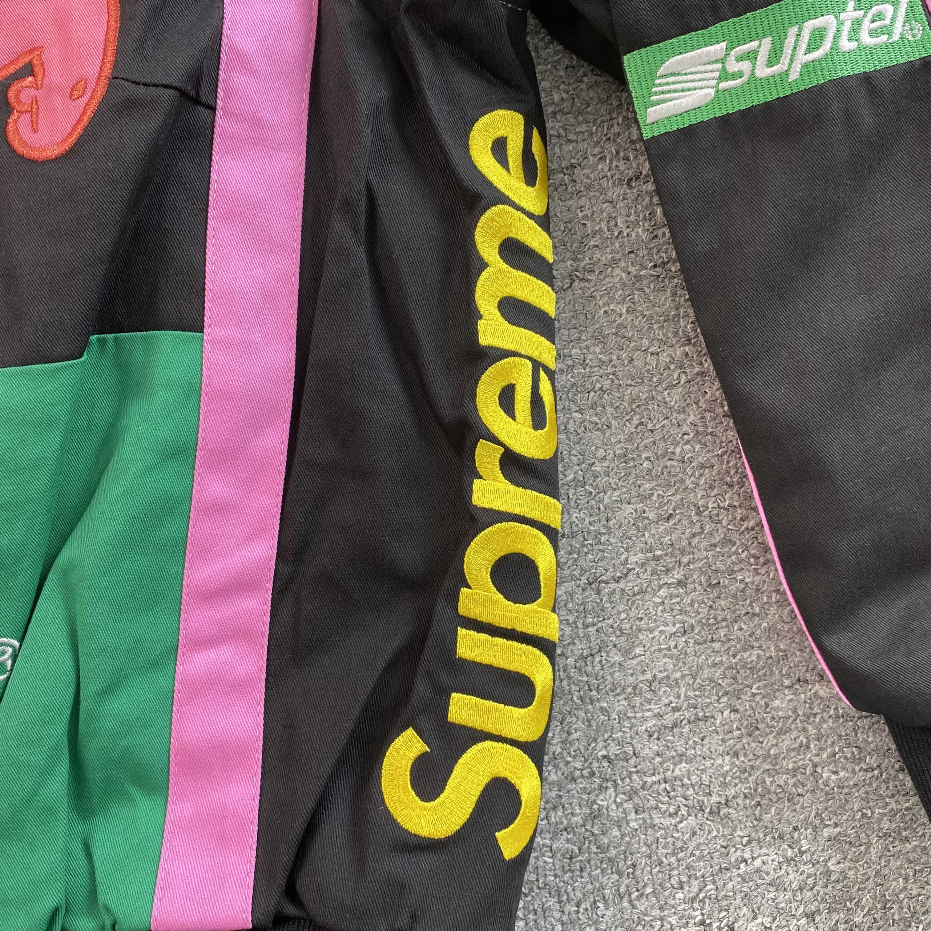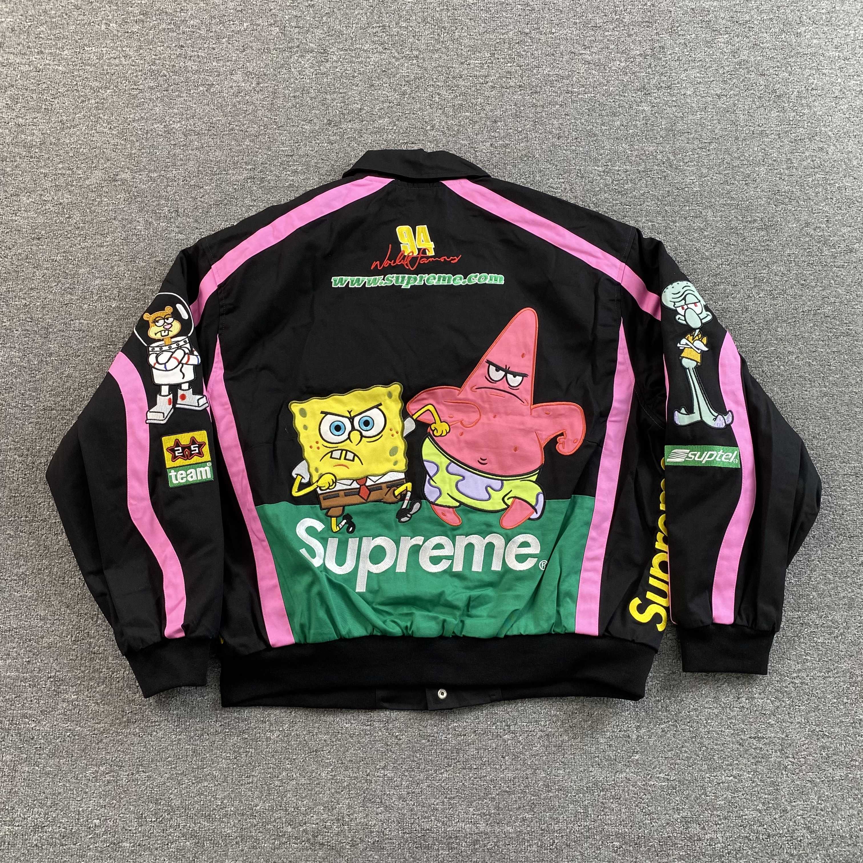 The Supreme SpongeBob SquarePants Jeff Hamilton Racing Jacket in Black is a standout streetwear piece that merges iconic pop culture with premium fashion. Featuring SpongeBob graphics and Jeff Hamilton’s signature racing jacket style, this jacket delivers bold aesthetics, comfort, and collectible appeal.
